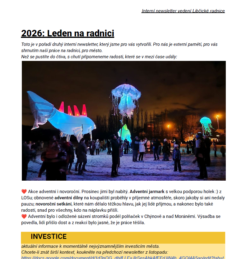 Informace chybí i tam, kde mají lidé k sobě blízko, v našem spolku. Nikdy jich není dost. A tak jsme začaly psát newslettery. Začaly – protože my, dvě ženy ve vedení města. Množné číslo – protože už jich je víc než jeden. Aktuální, neformální souhrn toho, čemu se věnujeme – investičním a dotačním projektům, provozním záležitostem i kulturním aktivitám.